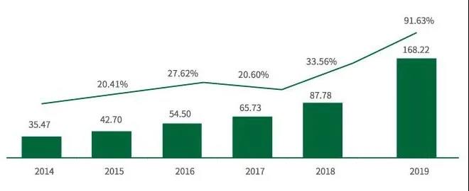 龍大肉食2014-2019年營收(億元)及增長(cháng)率(%)